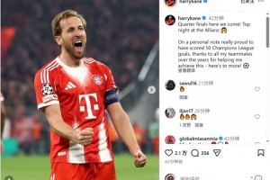 凯恩社媒晒出庆祝进球的照片,配文:“四分之一决赛,我们来了!安联球场的精彩夜晚!”