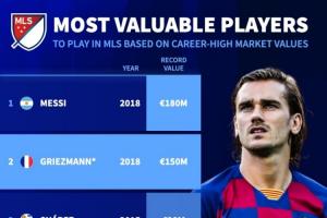 据德转统计,格列兹曼成为巅峰身价第二高的美职联球星,他的巅峰身价是2018年时的1.5亿欧,仅次于梅西的1.8亿欧。