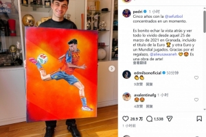 佩德里获赠一幅画作,内容为他身穿西班牙国家队球衣的形象,佩德里社媒晒出这幅画作,配文:“西班牙国家队的五年时光,所有回忆凝聚于此刻。回首往事是多么美好,自2021年3月25日在格拉纳达的那个日子以来,我们经历了太多,包括一座欧洲杯冠军,以及另外一次欧洲杯和世界杯的征程。感谢这份厚礼,这简直是一件艺术品!”